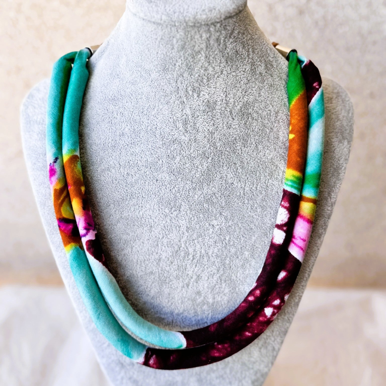 Com um design de 2 voltas, cria presença na zona do peito, mantendo leveza e conforto. Feito `a mão em capulana, combina tradição e estilo contemporâneo numa peça única e cheia de identidade.